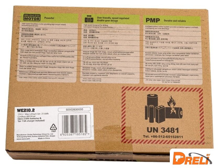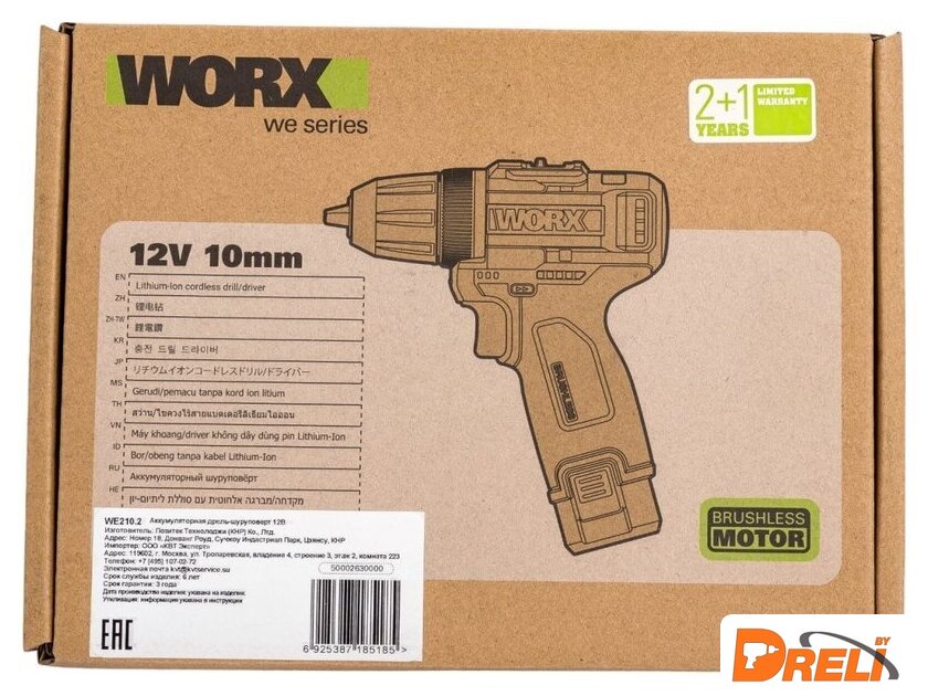 | Комплектация | Дрель-шуруповерт WORX Professional WE210.22 аккумулятора Li-Ion емкостью 2 А*чЗарядное устройство WORX Professional 12В 1,5AКоробка |