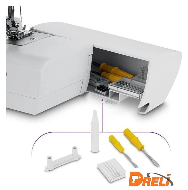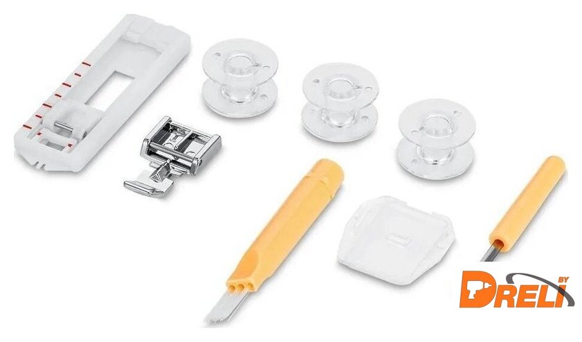 | Комплектация | пластиковые шпульки, вспарыватель, пластина для штопки, набор игл № 90/14, малая и большая отвертки, двойной верхний держатель катушки |