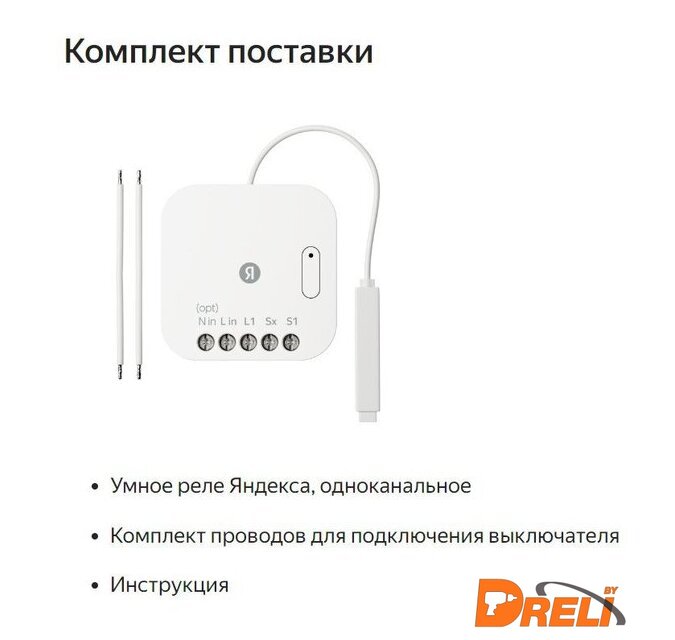 Комплектация | Умное реле Яндекса, одноканальноеКомплект проводов для подключения выключателяИнструкция |