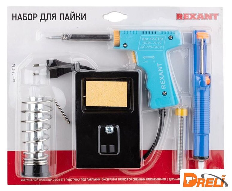 Комплектация | Импульсный паяльник 30/70 Вт;Подставка под паяльник;Спиралевидный держатель паяльника;Оловоотсос (экстрактор припоя);Припой с канифолью в колбе;Упаковка. |
