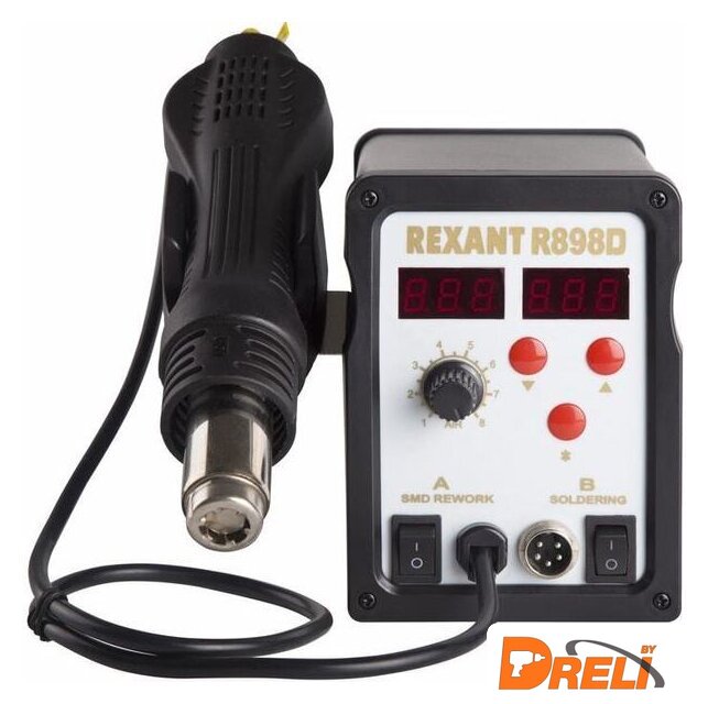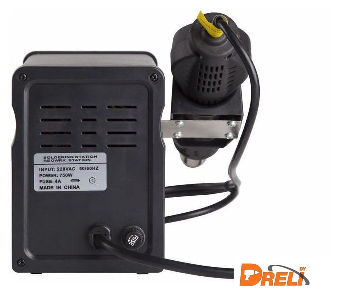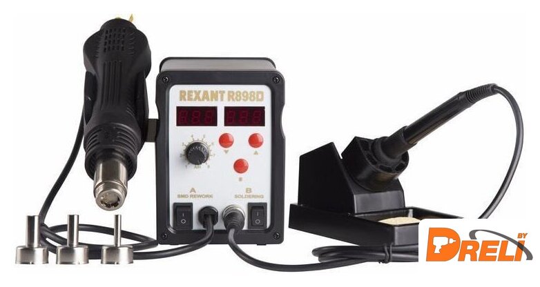 | Комплектация | основной блок, термофен, паяльник, держатель паяльника, держатель термофена, губка для очистки жала паяльника (в ложементе), 3 насадки для термофена разного размера. |