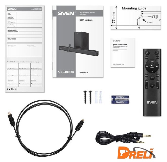 Комплект поставки | - звуковая панель- беспроводной сабвуфер- пульт ДУ- батарейки для пульта ДУ (2xAAA)- аудиокабель 3.5 мм- оптический аудиокабель- кабель питания- шаблон для крепления на стену- документация |