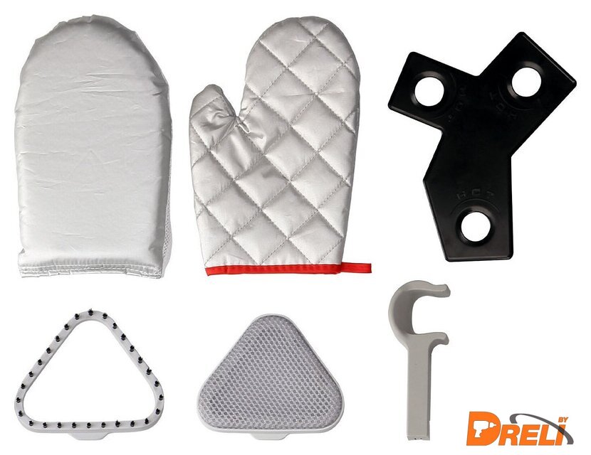 | Дополнительные насадки и приспособления | - 3-х секционная телескопическая стойка 2 шт., - теплоизолированный шланг с утюжком,- гладильная доска, - держатель утюжка, - насадка-щетка, - контейнер для воды, - теплоизолированная рукавица 2 шт., - приспособление для отпаривания воротника, - крышка сливного отверстия бойлера |