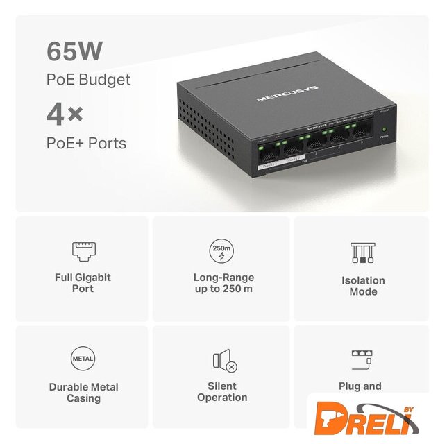 Характеристики портов PoE | RJ45Стандарты: 802.3af/atПорты с поддержкой PoE: 1–4Общий бюджет PoE: 65 Вт |