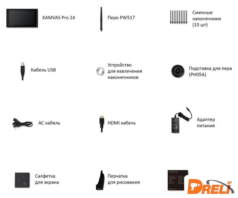 | Комплект поставки | - перо PW517;- сменные наконечники (10 шт.);- кабель USB;- устройство для смены наконечников;- подставка для пера;- адаптер и кабель питания;- HDMI кабель;- салфетка для экрана;- перчатка для рисования;- документация; |