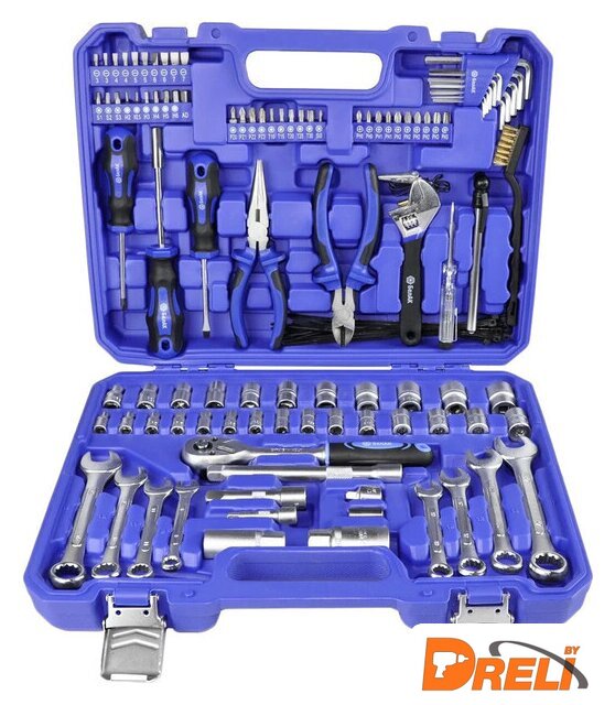 Комплектация | - 1/4" Головки торцевые: 4, 4.5, 5, 5.5, 6, 6.5, 7, 7.5, 8, 9, 10, 11, 12, 13, 14 мм- 1/4" Адаптер- 1/4" Удлинитель- 3/8" Головки торцевые: 8, 9, 10, 11, 12, 13, 14, 15, 16, 17, 19 мм- 3/8" Головки торцевые свечные: 16, 21 мм- 3/8" Ключ трещоточный- 3/8" Удлинитель 2 шт.- 3/8" Адаптер- Биты 25 мм: SL3х2, SL4x2, SL5x2, SL6x2, SL7x2, PН0x2, РН1x2, РН2x4, РНЗx2, РZО, РZ1, РZ2, РZ3, Т10, Т15, Т20, Т25, Т30, S0, S1, S2, S3, АD, Н2, Н2.5, НЗ, Н4, H5, Н6- Комплект шестигранных ключей: 1.27, 1.5, 2, 2.5, 3, 3.5, 4, 4.5, 5, 5.5, 6 мм- Комплект комбинированных ключей: 8, 10, 11, 12, 13, 14, 15, 17 мм- Индикаторная отвертка: 12-220 В- Отвертка битодержатель 150 мм- Отвертки: SL5x75 мм, РН1х75 мм- Хомуты 20 шт.: 200 мм- Щетка металлическая- Индикатор давления- Разводной ключ: 150 мм- Бокорезы 150 мм- Длинногубцы 150 мм- Кейс для хранения |