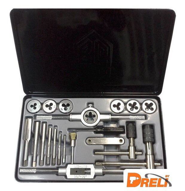 Комплектация | Плашка: М3х0,5; М4х0,7; М5х0,8; М6х1,0; М8х1,25; М10х1,5; М12×1,25 ммМетчик однопроходной: М3х0,5; М4х0,7; М5х0,8; М6х1,0; М8х1,25; М10х1,5; М12×1,25 ммКлюч для плашек 25 x9 мм Ключ для метчиков М3-М12 Ключ быстрозажимной для метчиков Т-образный М3-М6 Ключ быстрозажимной для метчиков Т-образный М5-М12 Резьбомер: 0,5-2,5 ммЩётка Отвертка |