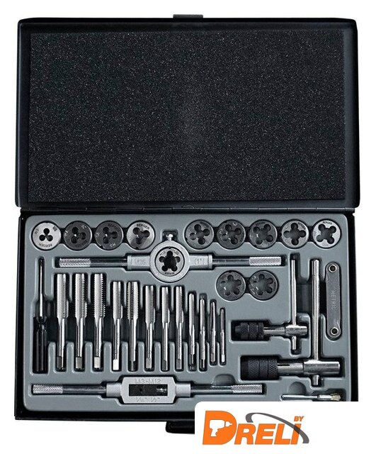 | Комплектация | Плашка: М3х0,5; М4х0,7; М5х0,8; М6х1,0; М8х1,0; М8х1,25; М10х1,5; М10х1,25; М10х1; М12х1,5; М12х1,75; М12х1,25 мм;Метчик однопроходной: М3х0,5; М4х0,7; М5х0,8; М6х1,0; М8х1,0; М8х1,25; М10х1,5; М10х1,25; М10х1; М12х1,5; М12х1,75; М12х1,25 мм;Ключ для плашек 25х9Ключ для метчиков М3-М12Ключ быстрозажимной для метчиков Т-образный М3-М6Ключ быстрозажимной для метчиков Т-образный М5-М12Резьбомер: 0,5-2,5 ммЩетка |