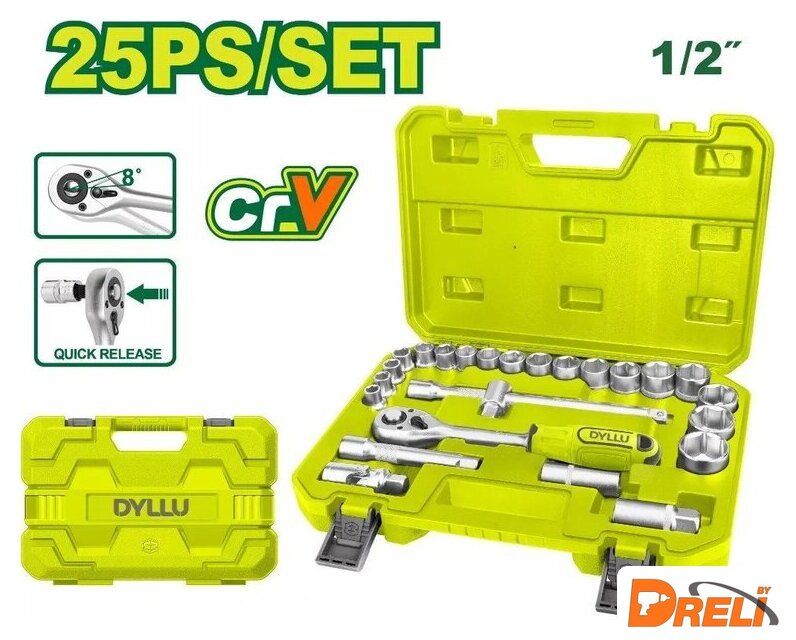 | Комплектация | трещотка 1/2" 45T - 1 шт.; торцевые головки 1/2" (10, 11, 12, 13, 14, 15, 16, 17, 18, 19, 20, 21, 22, 23, 24, 27, 30, 32 мм) - 18 шт.; свечная головка 16, 21 мм - 2 шт.; вороток T-образный с бегунком 1/2" (250 мм) - 1 шт.; универсальный шарнир 1/2'' дюйма - 1 шт.; удлинитель 1/2" (125 мм) - 1 шт.; кейс |