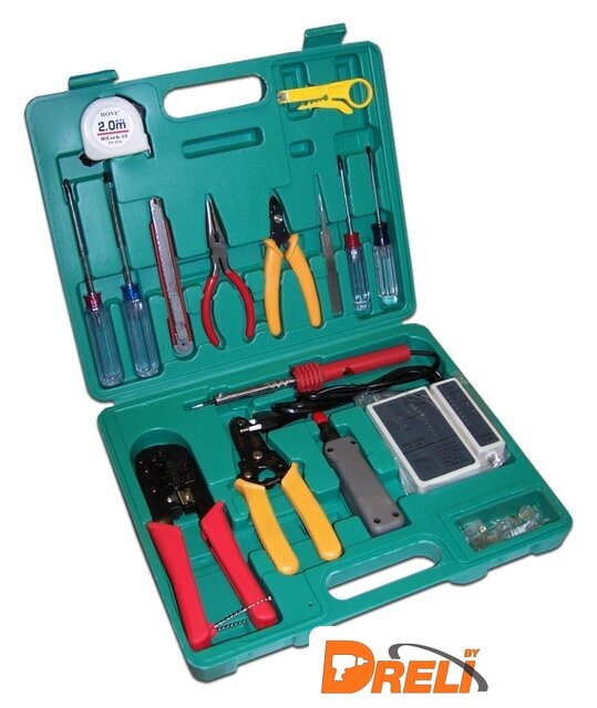 | Комплектация | - Инструмент для обжима коннекторов RJ-12 и RJ-45, боковой;- Инструмент для снятия изоляции с жил кабеля;- Ударный инструмент 110-го типа, под сменные лезвия;- Паяльник электрический 30Вт/220В;- Тестер для определения правильности расключения витопарных кабелей (без батареек);- Коннектор RJ-45 8P8C cat 5E – 8штук; Рулетка 2м;- Отвертка под плоский шлиц (длина 180мм);- Отвертка под плоский шлиц (длина 150мм);- Отвертка под крестовой шлиц (длина 180мм);- Отвертка под крестовой шлиц (длина 150мм);- Нож монтажный;- Узкогубцы;- Бокорезы;- Пинцет;- Устройство для зачистки и забивки жил в контакты IDC. |
