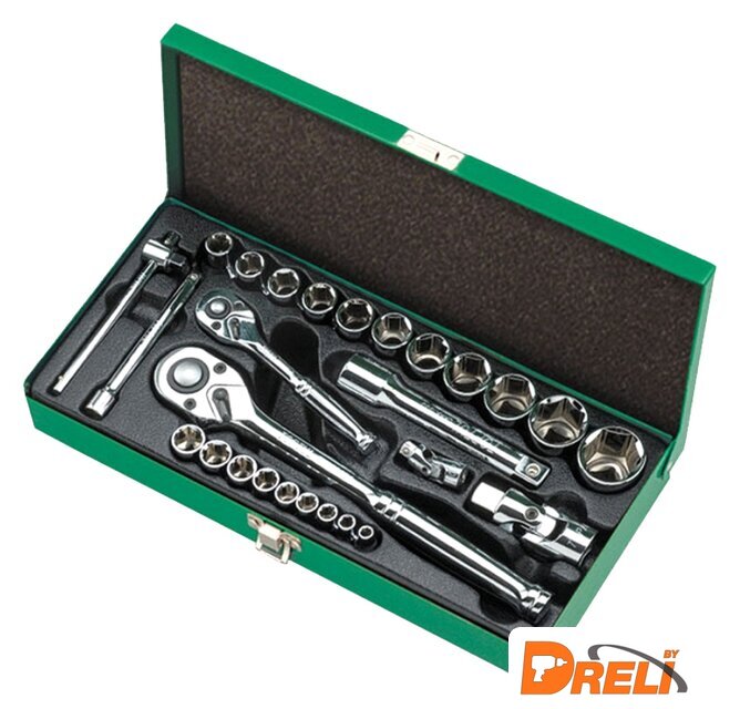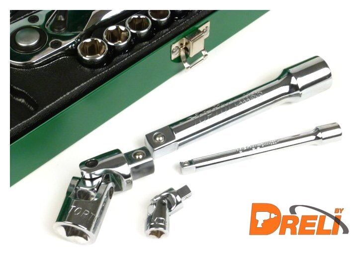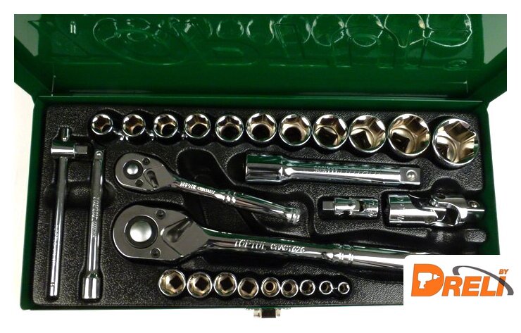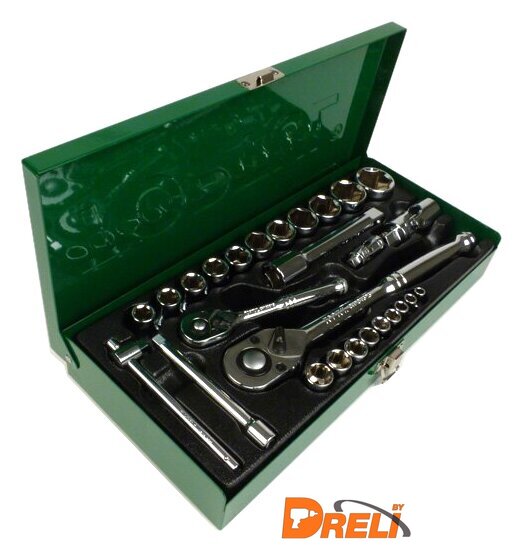 Комплектация | 1/4" – головки торцевые шестигранные 6PT : 5, 6, 7, 8, 9, 10, 11, 12, 13 мм.1/2" – головки торцевые шестигранные 6PT : 10, 11, 12, 13, 14, 16, 17, 19, 21, 24, 27 мм. ;1/4" трещотка ;1/2" трещотка;1/4" вороток с плавающей головкой 115 мм.;1/4" карданный шарнир;1/2" карданный шарнир;1/4" удлинитель 100 мм.;1/2" удлинитель 125 мм. |