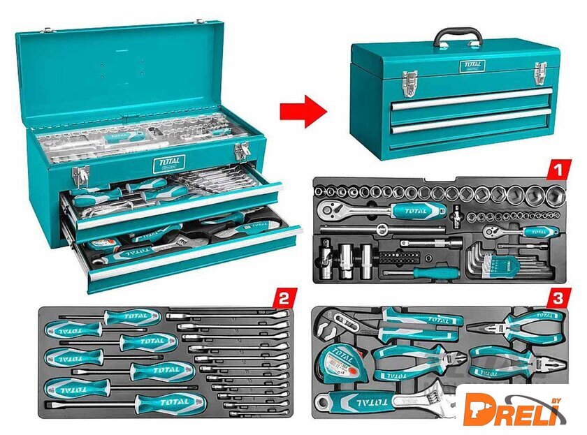| Комплектация | КомплектацияПервый ящик 70 шт.:Биты: SL3, SL4, SL5, SL6, PH0, PH1, PH2, PH3, PZ0, PZ1, PZ2, PZ3, T10, T15, T20, T30, H3, H4, H5, H6 - 20 шт.Шестигранные головки 1/2": 8 мм, 10 мм, 12 мм, 13 мм, 14 мм, 15 мм, 16 мм, 17 мм, 18 мм, 19 мм, 20 мм, 21 мм, 22 мм, 23 мм, 24 мм, 27 мм, 30 мм, 32 мм. - 18 шт.Шестигранные головки 1/4": 4 мм, 4,5 мм, 5 мм, 5,5 мм, 6 мм, 7 мм, 8 мм, 9 мм, 10 мм, 11 мм, 12 мм, 13 мм, 14 мм. - 13 шт.Ключ с трещоткой 1/2" (45 зуб.) - 1 шт.Ключ с трещоткой 1/4" (45T) - 1 шт.Ручка для торцевых головок 1/4" - 1 шт.Удлинитель 1/2": 125 мм (5"), 250 мм (10") - 2 шт.Свечи зажигания 1/2": 16 мм и 21 мм - 2 шт.Универсальный шарнир 1/2" - 1 шт.Универсальный шарнир 1/4" - 1 шт.Рукоятка 1/2" Flex, 375 мм - 1 шт.Шестигранные ключи 1,5 мм, 2 мм, 2,5 мм, 3 мм, 4 мм, 5 мм, 6 мм, 8 мм, 10 мм - 9 шт.Второй ящик 19 шт.:SL3*75мм, 4*100мм, 5*125мм, 6*100мм, 8*200мм, PH1*80мм, PH2*100мм, PH3*200мм - 8 шт.Комбинированные гаечные ключи: 6 мм, 7 мм, 8 мм, 9 мм, 10 мм, 11 мм, 12 мм, 13 мм, 14 мм, 15 мм, 17 мм. - 11 шт.Третий ящик 7 шт.:Комбинированные плоскогубцы 8" - 1 шт.Длинногубцы 6" - 1 шт.Бокорезы 7" - 1 шт.Шлицевая отвертка 10" - 1 шт.Клещи переставные 10" - 1 шт.Рулетка 3 м * 16мм - 1 шт.Универсальный нож - 1 шт. |