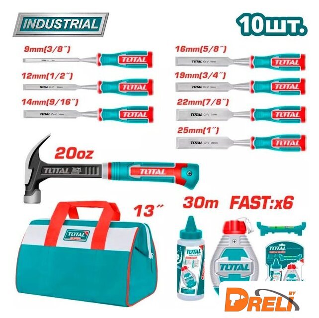 | Комплектация | - Молоток-гвоздодер THCH61020L - 1 шт.- Набор THT666301 (шнур разметочный 30м, мел 113г, уровень) - 1 шт.- Стамески THT4196, THT41126, THT41146, THT41166, THT41196, THT41226, THT41256 (9, 12, 14, 16, 19, 22, 25 мм) - 7 шт.- Сумка для инструментов THT261325 - 1 шт. |