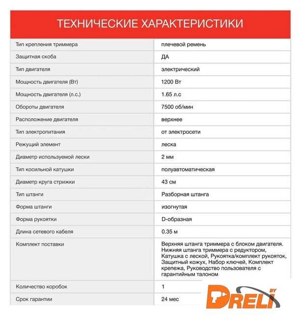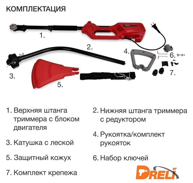Комплектация | - Верхняя штанга триммера с блоком двигателя. - Нижняя штанга триммера с редуктором, - Катушка с леской, - Рукоятка/комплект рукояток, - Защитный кожух, - Набор ключей, - Комплект крепежа, - Руководство пользователя с гарантийным талоном. |