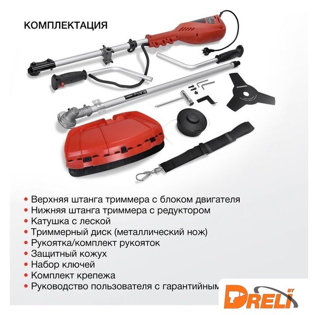 Комплектация | - Верхняя штанга триммера с блоком двигателя- Нижняя штанга триммера с редуктором- Катушка с леской- Триммерный диск (металлический нож)- Рукоятка/комплект рукояток- Защитный кожух- Набор ключей- Комплект крепежа- Руководство пользователя с гарантийным талоном |