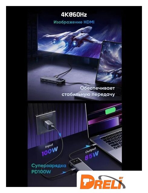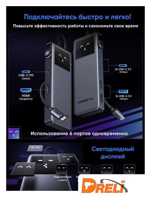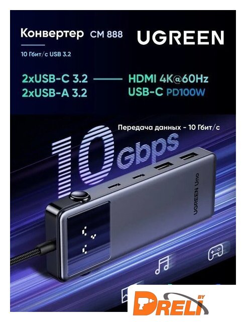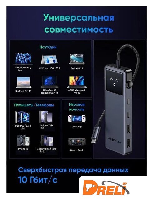 | Все разъемы на адаптере | USB-A 3.2 Gen2 (10 Гбит/с), USB-C 3.2 Gen2 (10 Гбит/с), HDMI, USB-C (только для зарядки) |