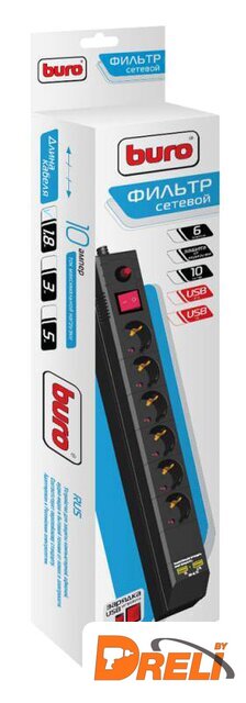 сетевой фильтр, кабель 1.8 м, 6 розеток Schuko (евро с заземлением) / 2200 Вт/USB