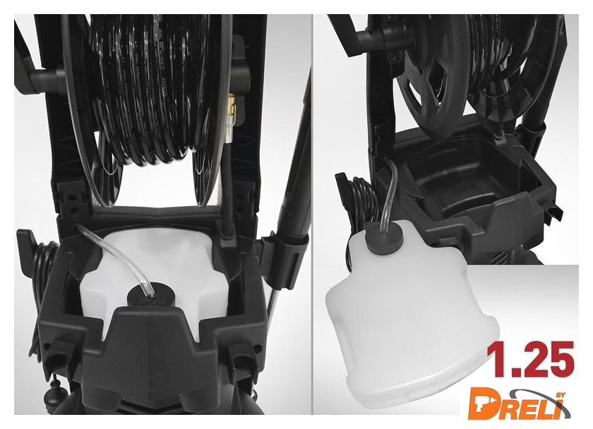 Комплектация | - Пистолет высокого давления с регулируемой грязевой фрезой.- 5м шланг высокого давления c системой E-click.- Штуцер подключения к садовому шлангу 3/4” со встроенным фильтрующим элементом.- Встроенный пенный генератор с емкостью для моющей жидкости объемом 1,25 л. |