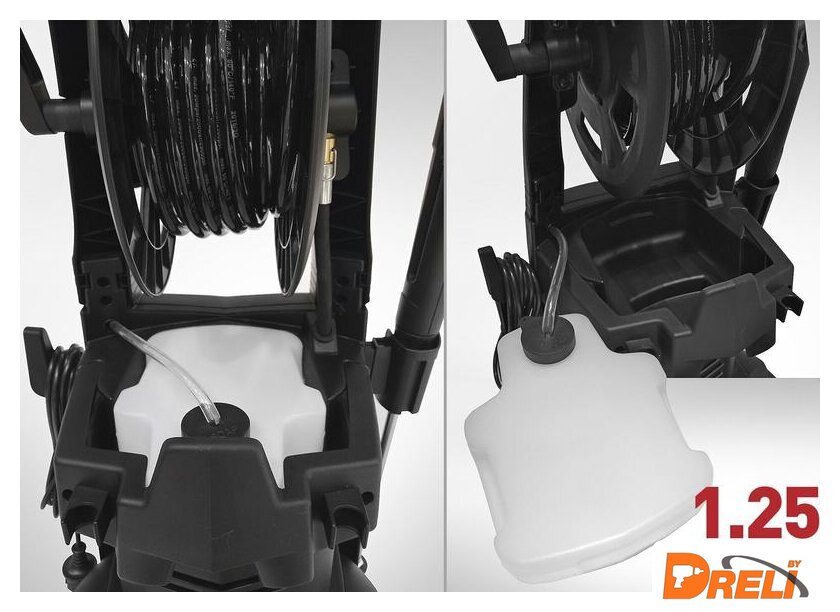 Комплектация | - Пистолет высокого давления с регулируемой грязевой фрезой.- 5м шланг высокого давления c системой E-click.- Штуцер подключения к садовому шлангу 3/4” со встроенным фильтрующим элементом.- Встроенный пенный генератор с емкостью для моющей жидкости объемом 1,25 л. |