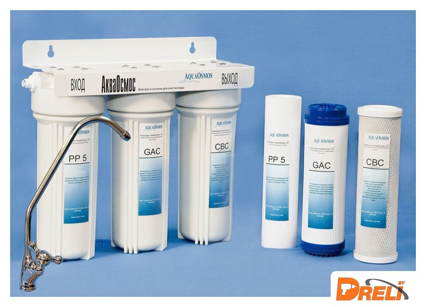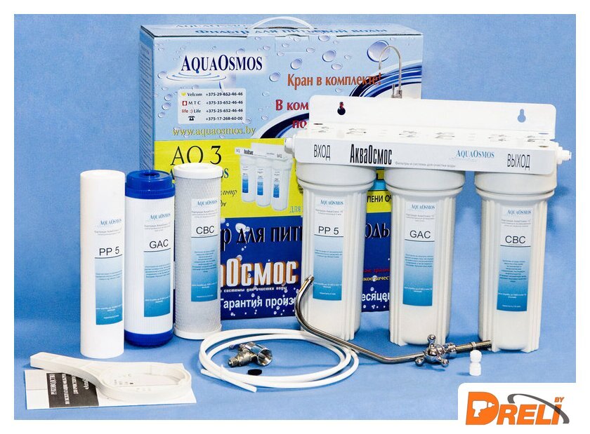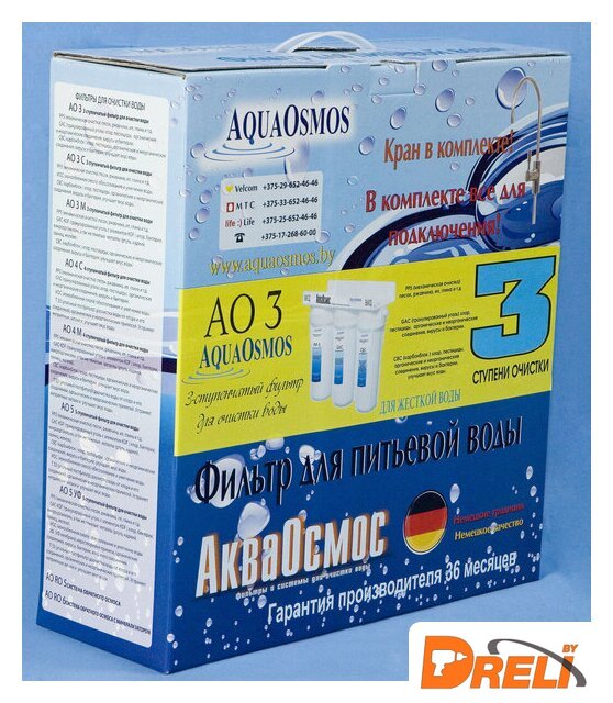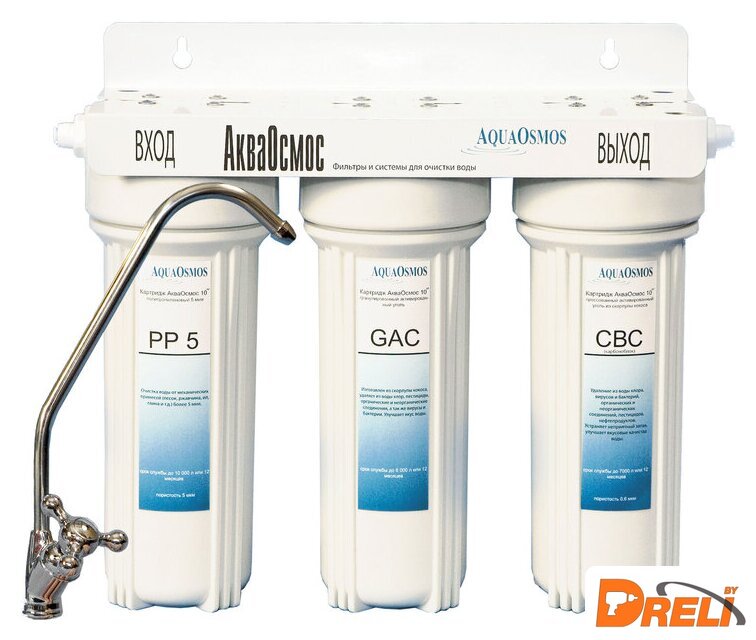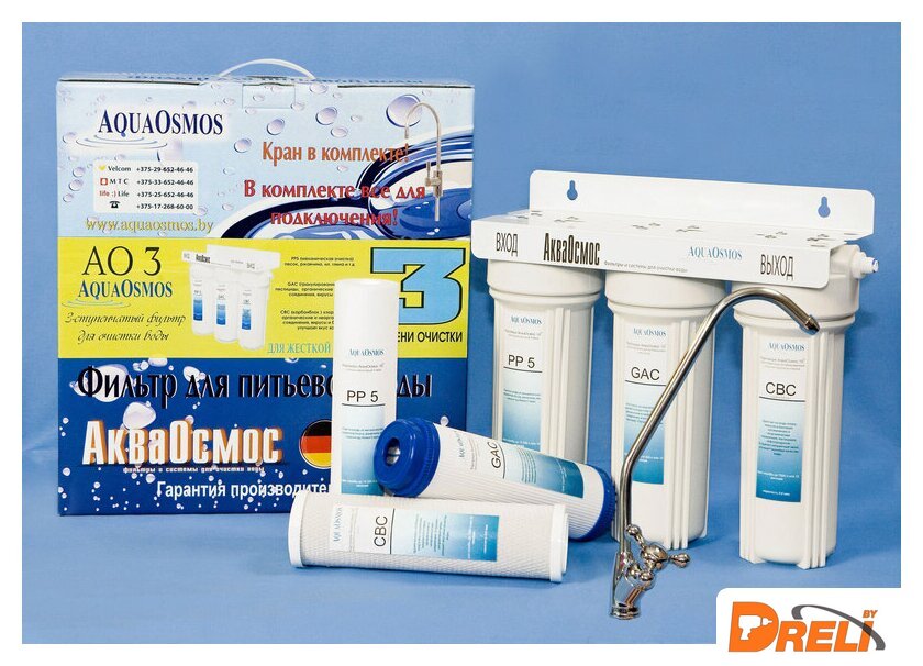 | Описание фильтра | Фильтр для очистки воды АО 3 обеспечивает защиту от жесткой воды. Благодаря трехступенчатой системе фильтрации фильтр убирает механические частицы (песок, ржавчина, ил, глина и т. д.), хлор, пестициды, органические и неорганические соединения, вирусы и бактерии. Удаляет неприятные запахи, посторонние привкусы, улучшает вкус и качество воды. В комплектацию входят сам фильтр, комплект картриджей, кран для чистой воды и полный набор для легкого подключения фильтра собственными силами. |