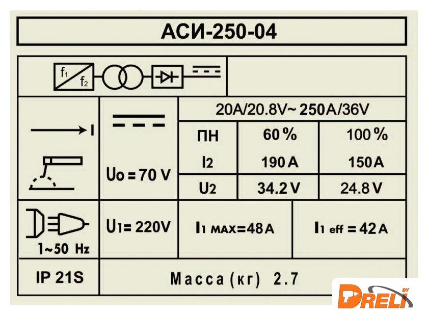 | Сварочный ток | 20 — 250 А |