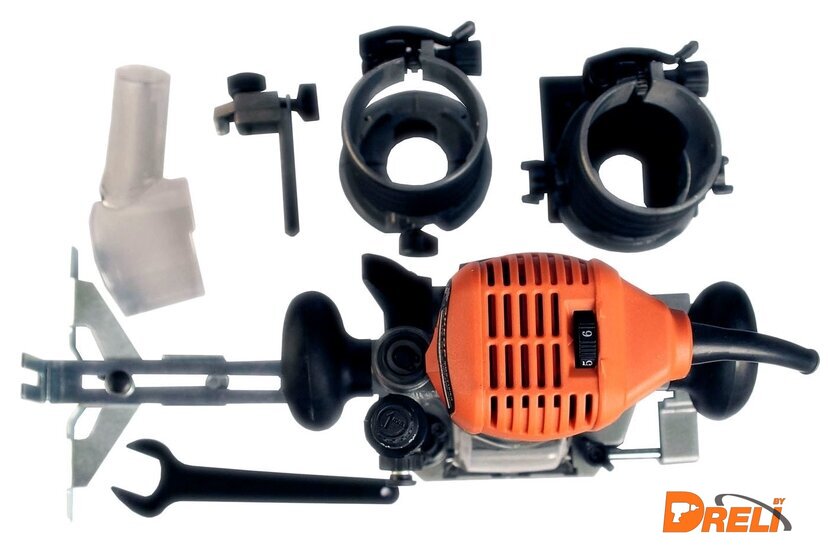 Комплектация | - Фрезерная машина- Базовое основание- Основание кромочное- Основание угловое- Цанги 8 и 6 мм- Упор подвижный- Упор регулируемый- Ключ специальный- Пылеотвод- Экран защитный- Руководство по эксплуатации- Картонная коробка |