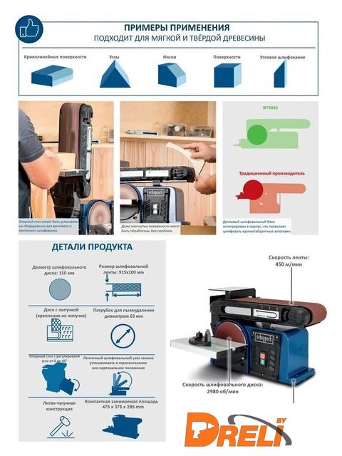 | Комплект поставки | - 1 ленточная и дисковая шлифовальная машина- 1 поперечный упор- 1 шлифовальный стол- 3 шлифовальные ленты P80 / P120 / P240- 3 шлифовальных диска P80 / P120 / P240- 1 шестигранный ключ- 1 руководство по эксплуатации |