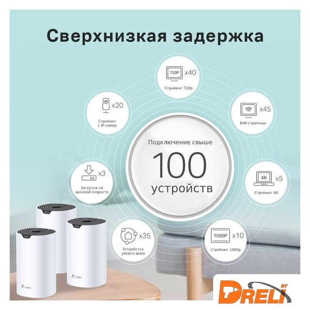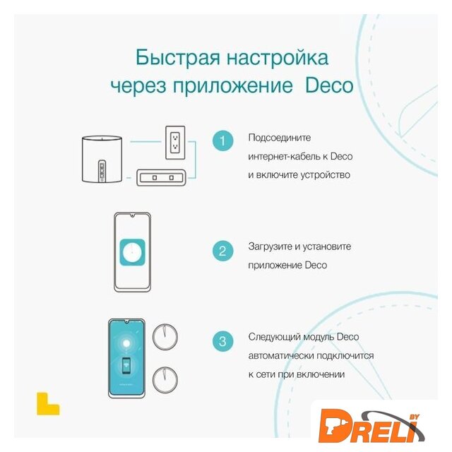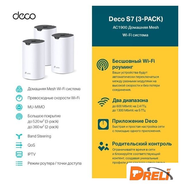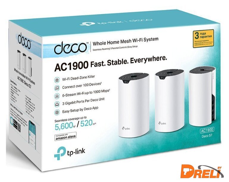 | Комплектация | Deco S7 (3 шт.)Кабель Ethernet RJ45Адаптер питания (3 шт.)Краткое руководство по настройке |